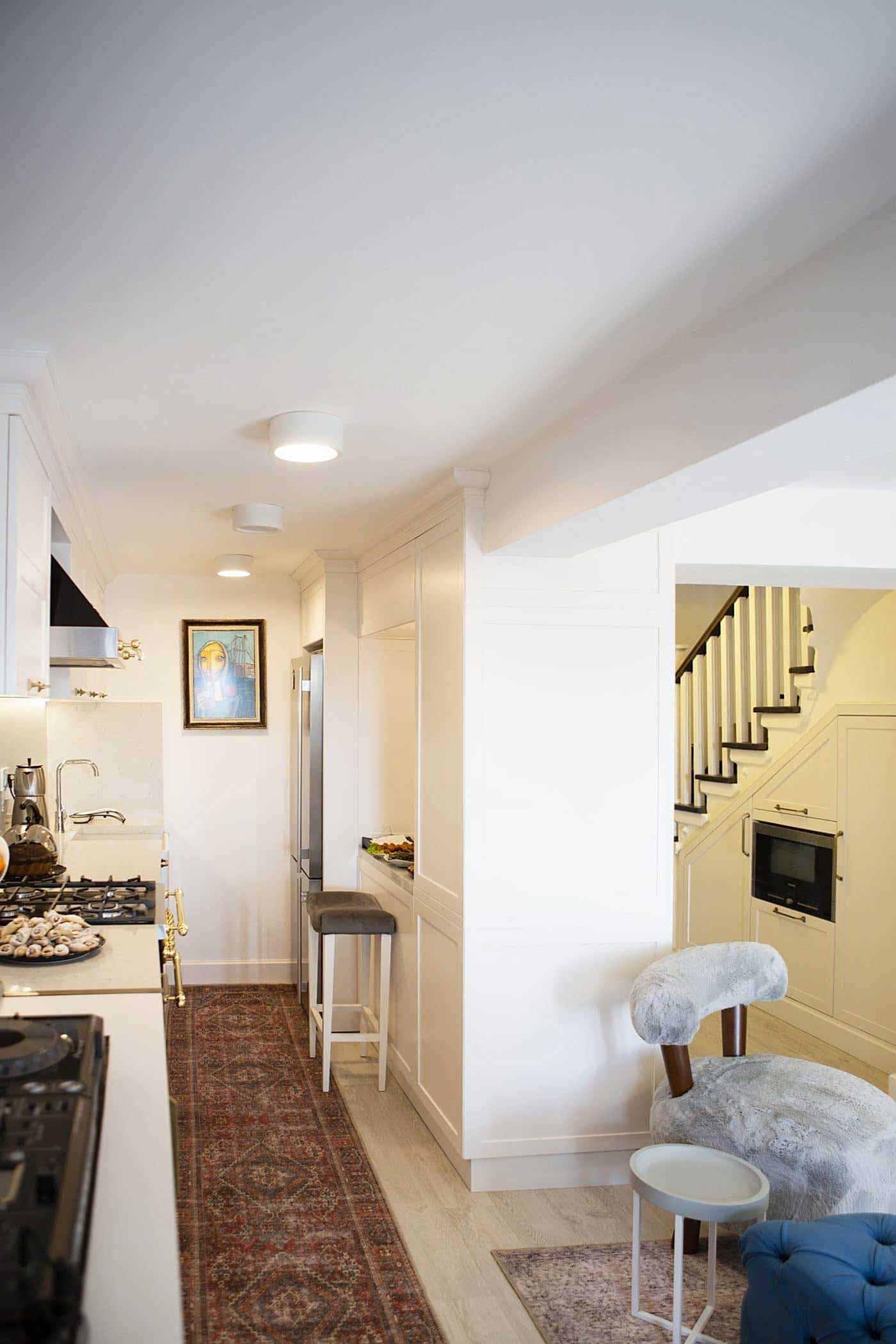 Güzel bir manzaraya sahip evin ışığını maksimum verim ile mekana yansıtmak amacıyla beyaz ahşapların yanında, tv alanını özelleştirdiğimiz antrasit pano ile mekana soluk getirildi. Öykü Hanım’ın zevkli mobilyaları ile tamamlanan projemiz bizim için keyifli bir tasarım ve uygulama süreci oldu.